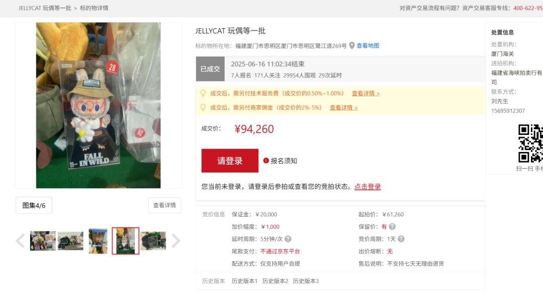 6月16日,厦门海关涉案JELLYCAT玩偶等一批也在京东资产交易平台拍卖,其中包括5个泡泡玛特玩偶等。经过34轮竞价,最终以9.426万元成交,较起拍价高出3.3万元。